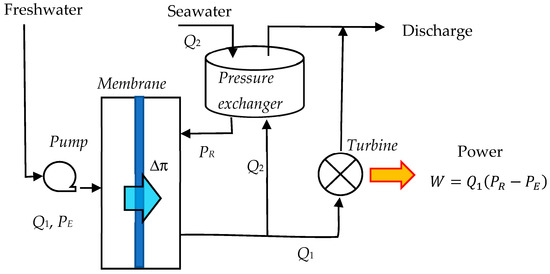 The membrane process under consideration is schematically shown in Figure 1. A flow cell is divided into a draw chamber and feed chamber with a semipermeable membrane. The freshwater of negligible osmotic pressure is fed into the feed chamber at a flow rate Q1 under the hydraulic pressure of PE. The seawater of osmotic pressure Δπ is circulated through the draw chamber at a flow rate Q2 under hydraulic pressure of PR (>PE). The freshwater permeates through the membrane into the draw chamber and acquires the higher hydraulic pressure. The flow out of the draw chamber is split into two streams. One stream of flow rate Q2 goes to the pressure exchanger to pass the pressure to the incoming seawater and then is discharged. The other stream of flow rate Q1 is used to turn the hydro-turbine to produce mechanical or electrical energy. The hydraulic pressures on feed side and draw side will be referred as the “external pressure” and “retarded pressures” from now on, respectively.