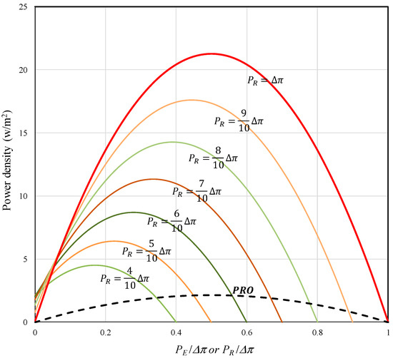 The second step is to use Equation (5) to find the optimal PR that maximizes the power density of the membrane for a given osmotic pressure of the draw solution. Similarly, the derivative of W in Equation (5) with respect to PR can be determined as