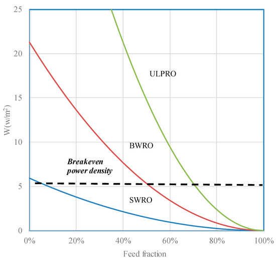 Power densities of typical SWRO, BWRO, and ULPRO membranes as functions of the feed fraction. The broken line indicates the economical breakeven point for harnessing SGE.