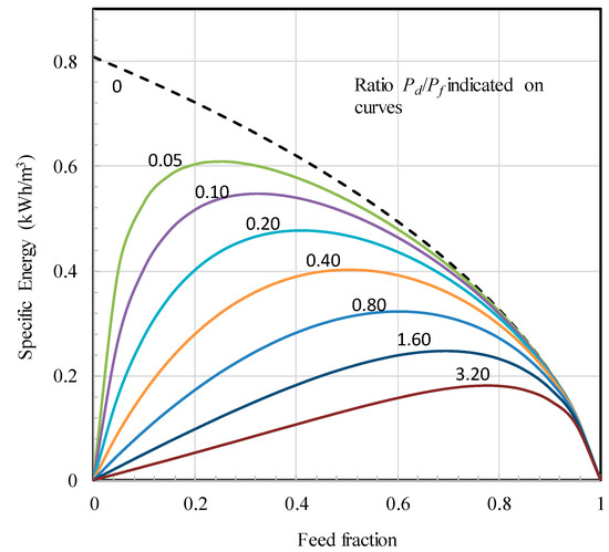 The specific energy of water for different ratios of pretreatment costs for draw solution and feed water were calculated, and the results are presented in Figure 5. The ratios of the pretreatment costs are indicated in the figure. The broken line indicates the limiting case in which there is no cost involved for pretreatment of the draw solution. It can be seen that when the pretreatment cost ratio Pd/Pf is around 0.40, the peak specific energy of water is approximately 0.40 kWh/m3 at the feed fraction of about 0.5. O’Toole et al. [26] and Altaee et al. [11] recently reported that the pretreatment cost for the river water was estimated to be 0.0665 kWh/m3 and 0.15 kWh/m3, respectively. Both research groups overestimated pretreatment costs of seawater for SGE production because the costs referred to were for desalination. Because seawater is the draw solution that moves away from the membrane, it is reasonable to assume a lower requirement for seawater for harnessing SGE than for desalination. When pretreatment cost for the seawater is lower or comparable to that for freshwater, net energy can be produced from the salinity gradient between seawater and river water.