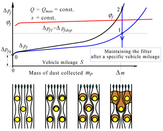 During engine operation, as a result of the deposition and accumulation of dust particles on the filter cartridge, filter pressure drop Δpf increases (Figure 2). The intensity of filter pressure drop increase depends on the conditions in which the vehicle is operated, mainly on dust concentration in air and vehicle (engine) operating time. Excessively contaminated air filter elements cause difficult air flow to the engine, which reduces engine cylinders from filling [25,26]. This directly affects conditions of fuel combustion process, which may deteriorate engine performance (power decrease and fuel consumption increase) or cause an unfavorable change in exhaust gas composition [27,28]. Therefore, manufacturers, depending on the engine type, set permissible pressure drop value Δpfdop, which should not be exceeded by the air filter while the vehicle is in use. For high power diesel engines, these values are in the range of 3.7–7.5 kPa [26]. For SI engines, Δpfdop values are within the range of 3.8–5 kPa [29], while in [30], it was stated that maximum pressure drop values limiting the air supply for diesel engines with a turbocharger usually assume values of 5–7, 6 kPa. For special vehicles engines, the admissible pressure drop values are in the range of 9–12 kPa [31]. From a technical point of view, air filter service life is commonly defined as the restriction level, which causes pressure drop in passenger car filter by about 2.5 kPa above the pressure drop of new (clean) filter [32]. For trucks and special vehicles, it is assumed that Δpfdop values are approximately 6.25–7.5 kPa above pressure drop of the clean air filter [33].