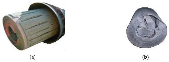 Truck and special vehicles driving units are self-ignition engines of high power and large (1000–6000 m3/h) volumetric air demand. Thus, air filters are large, heavy, time-consuming, and costly to maintain. These vehicles are operated in conditions of high and variable air pollutants concentrations, and thus pressure drop increase varies with intensity. Therefore, servicing the filter (performed after specified vehicle mileage standard) may be premature, which increases operating costs, or too late. In the second case, the increase in the filter pressure drop caused by the continuous accumulation of dust on the air filter element and resulting from the high dust concentration in the air, is more intense, which results in exceeding the set value of Δpfdop (Figure 1). Further operation of the filter is possible, but the rapidly increasing pressure drop causes an additional engine power decrease and a fuel consumption increase [33,34,35]. Moreover, the high negative pressure behind the filter and vibrations of the filter element caused by cyclically sucked air pulsations may also cause mechanical filter element destruction (Figure 3).