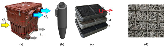 “Multicyclone—moistened filter bed” filtration system in tracked vehicles used for the research: (a) complete air filter (multicyclone indicated), (b) cyclone, (c) filter cassettes, (d) filter cassette cutout, QG—polluted air stream, QG—clean air stream, QG—air stream sucked in with dust.