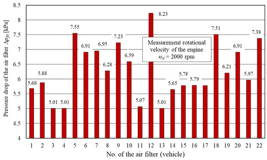 The research included 22 filters (in 22 caterpillar vehicles) that had been previously serviced. For such prepared air filters, their initial pressure drops Δpf0 were determined. Considerable differences in the values of these initial pressure drops were found within 5–8 kPa (Figure 5).