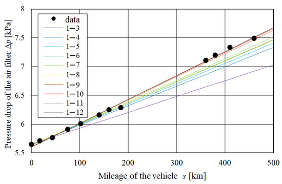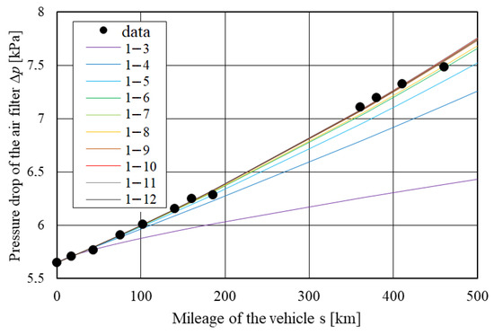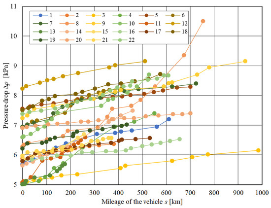 A difference in increase intensity in filter pressure drop value is also seen. The obtained mileages Δp = f(s) are not parallel (although it is noticeable for a large part of the mileages), but they intersect. These statements lead to the conclusion that these filters cannot be considered the same, which in turn makes it necessary to build individual models for each of them and excludes the possibility of building a generalised model for the filters of a concerned type. The conclusion about the impossibility of building a general model for the filter type is also confirmed by the curve line of the pressure drop value of the researched filters, shown in Figure 7 and Figure 8. In both of these figures, the mileages create the bunches of the curves arranged in a fan pattern. The observed changes in the value of the pressure drop of the researched filters are different, both in absolute and relative terms.
