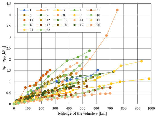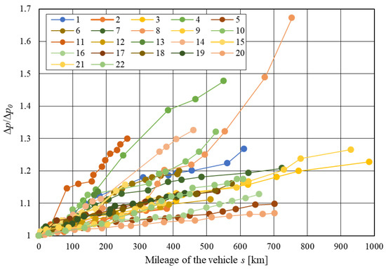 The obtained pressure drop values Δp normalised absolutely (differently) to their initial value Δp0 for researched vehicles mileage value s.