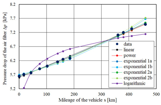 Among the analysed mileages, there are the ones whose shape for the entire curve line is visually the same—the nature of the increase in the value of the pressure drop is similar, whether in relation to the same values or to the changes in these values. Regrettably, for most of the mileages subject to the analysis, the value ranges with the clearly different natures are visible. Both ranges, with linear (with a different slope) and non-linear (sometimes concave, sometimes convex, with the inflection points) shapes of these mileages, can be distinguished. This may indicate radically different conditions of vehicle use between the measurements, i.e., driving with the different levels of air pollution: on grass, on sandy or rocky off-road, on dry or wet dirt road, platooning as the first vehicle (low air polluted) or as a subsequent vehicle (high dustiness in the air). The possibility of using the researched vehicles in such diametrically different conditions basically excludes drawing general conclusions about the intensity of pollution of the filtration barrier of the air filters, even for a single specimen. It is possible to assess this intensity and build a given model of the changes in pressure drop as a function of the vehicle mileage for the different filters used only under the same (possibly similar, but not significantly different) conditions. Each significant change in these conditions should result in the abandonment of the current model and the development of a new one. Information on the weather and road conditions between the measurements was unfortunately not recorded (which has resulted from research conditions), so visually noticeable changes in the value of the pressure drop of the filter cannot be related to the change in conditions of use of the vehicle. When modelling the course of these changes, a constancy of these conditions was arbitrarily assumed, and the models were built on the basis of all available experimental values, without dividing them into sets, giving visually the same nature of changes in the pressure drop.