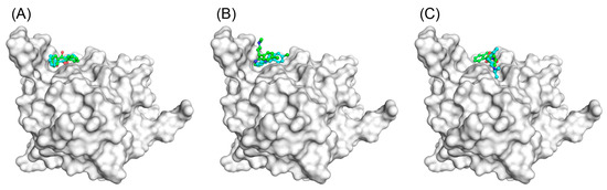 Docking structures of cAGP with (A) benzoin, (B) chlorpheniramine and (C) propranolol enantiomers. The built model structure of cAGP was illustrated as surface mode and the docked enantiomers were shown as ball-and-stick models, respectively.