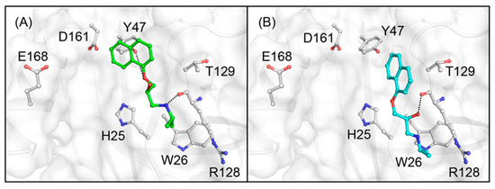 Finally, (R)- and (S)-propranolol were again docked to the generated model structure of cAGP (Figure 5). Interestingly, the docked propranolol was slightly shifted toward H25 and W26 with a consequent distance of 4.3 Å to H25. Although Y47 was again suggested to be involved in the binding of (R)-propranolol with a distance of 4.7 Å, it could be weak to anchor the docked propranolol. A carbonyl group for main chain between R128 and T129 was remarkably located to either 2.7 or 2.8 Å for (R)-propranolol or (S)-propranolol. The former hydrogen bonding interactions were with an amino group of (R)-propranolol, while the latter hydrogen bonding interactions were with a hydroxyl group of (S)-propranolol. These results indicate that the (R)-propranolol binding to cAGP is more favorable than the (S)-propranolol binding.