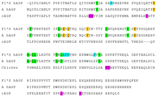 Sequence alignments of F1*S and A variant hAGPs and cAGP. The cavities in hAGP were called as lobes being highlighted in green for lobe I, orange for lobe II and cyan for lobe III. The amino acids, which consisted of feasible ligand-binding sites in this work, were colored in magenta.