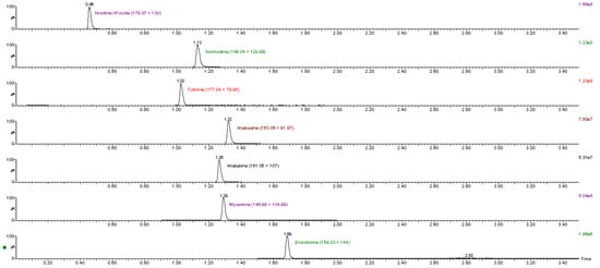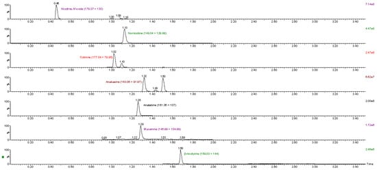 The analytes were separated within 2.0 min with a total run time of 3.5 min (including 1 min equilibration) and most peaks were well resolved. Example chromatograms with multiple reaction monitoring (MRM) transitions for the analytes in a standard mixture are shown in Figure 1. Only anabasine and myosmine could not be separated; however, due to different MRM transitions, each of them could be correctly quantified.