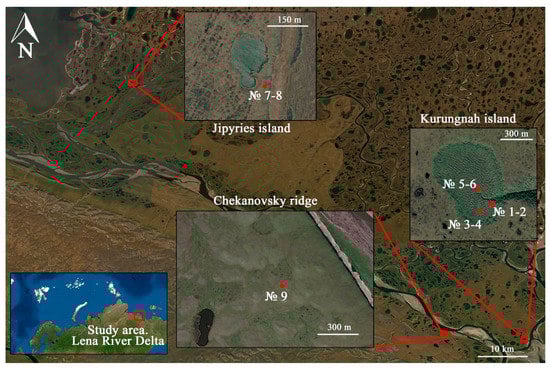The Lena River delta is the largest northern delta in the world; it is located in the Arctic zone and has an area of about 30,000 km2. The delta was formed as a result of river activity: sediment removal, erosion, abrasion under the influence of sea level fluctuations and movement of the earth’s crust [] (Figure 1).