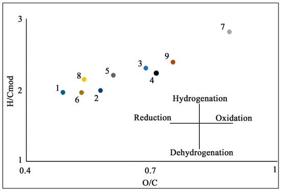 From the data obtained, the integral index of H/Cmod and O/C in most of the studied HAs was relatively low, which indicated a low content of oxygen-containing fragments in HAs. As mentioned above, high values of H/Cmod and O/C were observed in the sample from the second terrace (Jipyries Island) and indicated that the sample was formed in an environment with a low level of microbiological activity, which contributed to better preservation of the carbohydrate and amino acid fragments of HAs. A decrease in H/Cmod indicated the accumulation of fragments more resistant to biodegradation in the composition of HAs []. The most condensed molecules were formed in buried organic remains, which might have been related to the evolutionary selection of stable HA molecules [,].