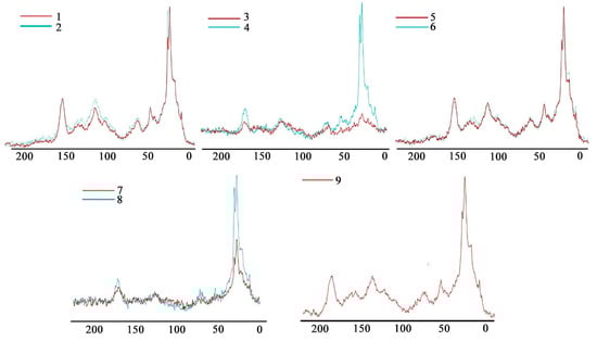 - Abakumov, E.; Lodygin, E.; Tomashunas, V. 13C NMR and ESR characterization of humic substances isolated from soils of two siberian Arctic Islands. Int. J. Ecol. 2015. [Google Scholar] [CrossRef]