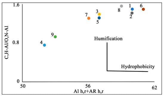 To standardize the quantitative characteristics of HA molecules, the following parameters were used: the degree of decomposition of organic matter (C-alkyl/O-alkyl) and the integral index of HA hydrophobicity (AL h, r + AR h, r) (Figure 5).