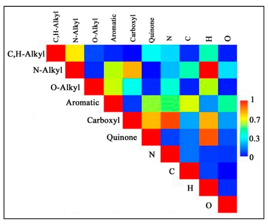 High correlation was observed in the nitrogen with carboxyl group (r = 0.9), hydrogen with N-alkyl (r = 1) and hydrogen with quinone (r = 0.89). As we said earlier, the composition of HAs from cryoconites varies greatly depending on biological (biochemical) processes, which is reflected in the elemental and qualitative composition of HAs.