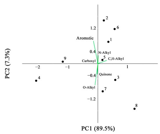 Under the conditions of the transformation of mosses and lichens, carbohydrates (mono- and oligosaccharides, cellulose, fats, alcohols) come into the soil [,,]. During their transformation, aliphatic acids with a content of fatty acids and paraffins are predominantly formed. Plant residues are the sources of various chemical structures, while the formation of aliphatic and aromatic structures is largely associated with the activity of the soil microbiota. The increase in the proportion of aliphatic fragments is associated with a high content of carbohydrates in plant residues as well as the possibility of producing these fragments by the soil microbiota itself. These substances are a larger part of the biochemical cycle and are consumed faster by living organisms [,,,].