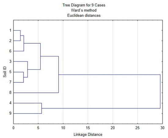 Based on the data obtained, we could distinguish two groups that were closest in terms of values (Soil ID 4, 9 and Soil ID 1–3, 5–8). The greatest differences were observed between the studied groups.
