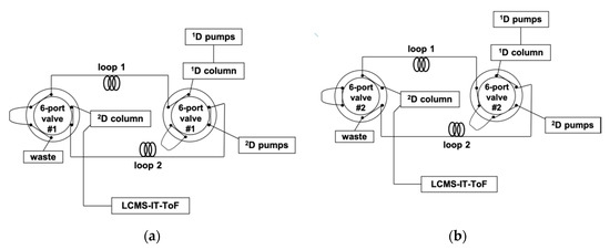 Schematic of the LC×LC system, showing the routes for each 2D separation, corresponding to different positions of the two six-port, two-position switching valves. (a) Loop 1 becomes filled with the 1D eluent, while the 2D pumps flush the content of loop 2 towards the 2D column. (b) Loop 2 becomes filled with the 1D eluent, while the 2D pumps flush the content of loop 1 towards the 2D column.