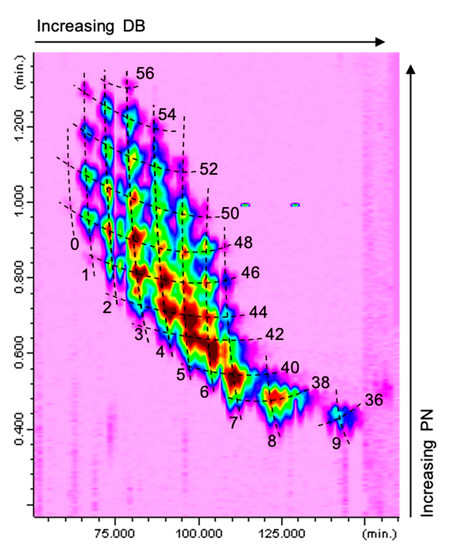 The Ag+-LC×NARP-UHPLC separation of a borage seed oil sample is shown in Figure 2 (relevant part of the TAGs elution region); the contour plot was obtained by IT-ToF detection through an APCI interface operated in the positive ionization mode. As can be easily appreciated, the TAGs are located characteristically in the 2D space according to their DB and PN values, as a result of the separation occurring in the 1D and 2D, respectively. The TAG sample components cover an extensive range of DB (between 0 and 9) and PN values (from 36 to 56), and were resolved by Ag+-LC×NARP-UHPLC through the complementary separation mechanisms of the two columns.