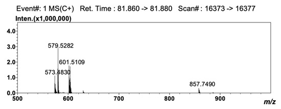 According to a widely accepted criterion, the investigated compounds were annotated employing initials of FA trivial names; sn-1 and sn-3 positions were not assigned and considered as equivalent, thus named according to the decreasing molecular masses of the FAs. Moreover, a preference of unsaturated fatty acids (mainly linoleic acid) in the sn-2 position is reported in the literature for plant oils [32]. For TAGs resulting from the combination of different FAs, three DG+ ions were observed, while for TAGs consisting of two or three moieties of the same FA, only two or one DG+ ions could be observed. As an example, the TAG showing a [M+H]+ ion of m/z 857.7504, could be assigned as the combination of oleic (O), palmitic (P) and linoleic acid (L), due to the presence of DG+ ions at m/z 575.5003, 577.5140 and 601.5109 (PL+, PO+ and LO+, respectively), i.e., the OLP molecule (#32 in Table 3). Likewise, two DG+ ions at m/z 603.5799 and 601.5135 (OO+ and OL+, respectively) appeared from the parent OLO molecule (#52 in Table 3), and only one DG+ ion at m/z 603.5292 (OO+) appeared from the parent OOO molecule (#34 in Table 3). The TAG composition of the sample investigated was in agreement with previously published data, in that a common characteristic of borage oil is the high levels of ω-6 polyunsaturated FAs (PUFAs), including linoleic acid (18:2) and γ-linolenic acid (18:3) [20,23].