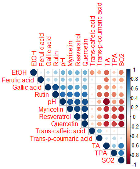 The results shown in Figure 2 clearly demonstrate that the most statistically significant correlations were for the parameters of quercetin, resveratrol, and pH, which correlated with all parameters except trans-caffeic acid. A similar result was observed for myricetin and rutin that did not significantly correlate only with trans-caffeic acid and also with ferulic acid. TA significantly correlated with all the parameters tested except trans-caffeic acid and trans-p-coumaric acid.