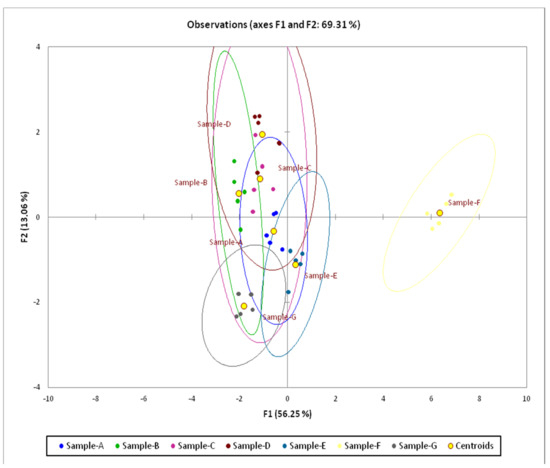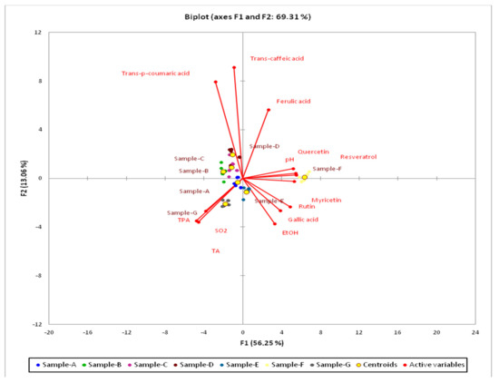 The Kaiser–Meyer–Olkin (KMO) test of sampling adequacy showed middling suitability of the data for the complete model (KMO = 0.67). Bartlett’s test of sphericity was significant (chi-square (observed) = 574, chi-square (critical) = 99.6, p ≤ 0.0001), indicating that the data were likely factorizable. The PCA revealed that 69.31% of the total variation embodied in 13 variables could be effectively condensed into and explained by the first two principal components (PCs), with eigenvalues of 7.31 and 1.69, respectively. PC1, accounting for 56.25% of the inertia, and PC2, explaining 13.06% of the inertia, clearly reflected the content of trans-caffeic acid and trans-p-coumaric acid. Figure 3 and Figure 4 show 2-D maps for PC1 and PC2 in which the tested variables are clustered around the centroids. The centroids present factor scores and squared cosines that are the coordinates and representation qualities, respectively. The most important variables for F1 were resveratrol, quercetin, myricetin, pH, and TA. The most important variables for F2 were trans-caffeic acid and trans-p-coumaric acid. Only the F variety was clearly separated from the other localities (Figure 3). The F variety was characterized by pH, myricetin, quercetin, and resveratrol. The B, C, and D varieties were characterized by trans-caffeic acid and trans-p-coumaric acid, while the A and G samples were characterized by total SO2, TPA, and TA. The E sample was characterized mostly by EtOH (Figure 4).