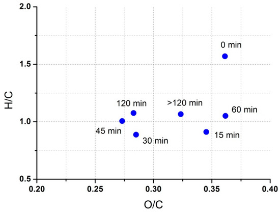 The dynamics of the OM composition of the samples are clearly traced in the diagram of atomic ratios (Figure 1). The raw material significantly differed from the LH samples in the widest H/C ratio, probably due to the presence of aliphatic moieties. At the initial stage of oxidation, there is a drastic decrease in H/C and a slight decrease in O/C. The latter continues to decrease up to 45 min, but at 60 min, secondary oxygen enrichment is observed, probably due to oxidation. The low O/C ratio in the LH samples is consistent with the low acidity (Table 1). During the first 30 min it drastically dropped from 1 to 0.2–0.3 meq g−1, and then after 45 min it slightly raised again, most probably due to oxidative carboxylation during treatment.