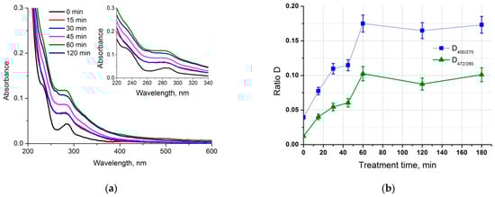 To extract more information from the absorption spectra, we calculated the absorbance ratios, which are not dependent on LS concentration and therefore can be used for sample characterization during technological processing with possible concentration alteration. The D270/400 characterizes the proportion of phenolic/quinoid core and simpler carboxylic aromatic compounds [54], and D280/472 reflects the proportion between the lignins and other materials at the beginning of humification [55,56]. To avoid mistakes caused by low absorption values in the visible region, we calculated the reciprocal values D400/270 and D472/280 (Figure 2b). The observed increase in absorbance ratios D400/270 and D472/280 (Figure 2b) demonstrates the presence of more complex chromophores such as charge transfer complexes, quinoid and semi-quinoid arrangements, and aromatic and/or heterocyclic zwitterions (aminochrome), etc. [57], absorbing light at longer wavelengths, in the visible spectral region. Thus, these two indices can indicate changes in the proportions of non-humified and humified material during treatment. Both ratios drastically increased during the first 60 min, then slowly stabilized (Figure 2b). This fact can support the consideration that after 60 min of synthesis, the stable HLS are formed.