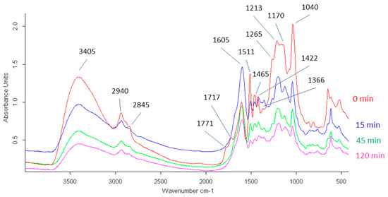 The FTIR analysis was performed to evaluate the main chemical attributes of initial LS and LH at different treatment times. The attributions of the main peaks were mainly obtained from references [15,29,58,59].