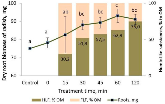 The biological activity of the LH samples of different treatment times generally follows the trend of HLF accumulation (Figure 5). However, the highest plant growth stimulation ability was observed not for the sample with the highest HLF content (at 120 min) but the one at 60 min. This indicates that either the quality (in other words, chemical structure) of HLS drastically changed after 60 min or that the non-humic FLF (containing carbohydrates, low molecular weight organic acids, and minor residual amino acids) also brings a valuable contribution to the manifestation of biological activity. As a biostimulant, LH can promote plant growth due to the complex emergent properties of the whole product rather than by the quantity and structure of HLF.