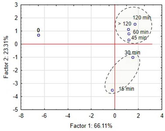The PCA plot (Figure 6) shows that LH samples can be divided into three groups, depending on the duration of the technological process of HLS synthesis: initial raw material (0-time sample); HLS of 15–30 min, and HLS after 45 min of oxidation. The differences within the samples taken after 45–120 min and more are insignificant. This allows concluding that at these two periods, the samples undergo significant qualitative changes. At the first stage, the decomposition of initial raw material and “artificial humification” resulting in a synthesis of newly formed HLS occur. At the second stage, the composition of HLS is getting stable, although, to some extent, they are subjected to secondary decomposition.