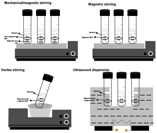 MMIP beads were first introduced by Ansell and Mosbach in 1998 as a core–shell structure (magnetic iron oxide, magnetite, Fe3O4) for performing drug radioligand binding assays [19]. Then, MMIPs (magnetic nickel hexacyanoferrate, NiHCF, nanoparticles coated with a molecularly imprinted polymer for the herbicide chlorotoluron) were proposed for preparing selective modified electrodes [20]. MMIPs as selective adsorbents for SPE procedures offer advantages such as avoidance of drawbacks associated with conventional batch SPE/µ-SPE procedures, which need filtration/centrifugation steps for separating the adsorbent from the bulk sample after the loading stage and from the extract after analyte elution. In addition, losses of adsorbent particles are minimized since adsorbent separation is easily and quickly achieved by applying a magnet [21]. As previously mentioned, MMIP nanoparticles can be stirred (dispersed) in the sample/extract (loading step) and in the eluting solution (elution step), taking advantage of their magnetic properties, but stirring can be also performed by vortexing and by ultrasound dispersion.