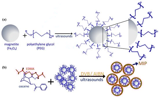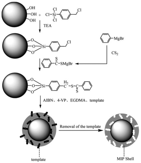 Hollow porous MIPs have been also designed by Fe3O4 nanoparticle surface modification by a sol–gel route with silica-based reagents such as tetraethyl orthosilicate (TEOS), which promotes hydroxyl groups on the surface of the magnetic nanoparticles, followed by MIP synthesis, and template and silica layer removal [42,43,44].