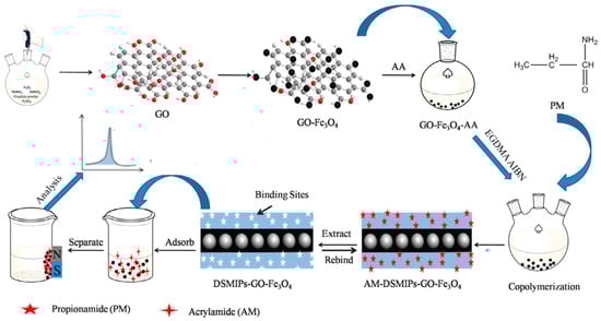 Schematic representation for preparation of acrylamide-dummy-surface molecularly imprinted polymers-graphene oxide-Fe3O4 (AM-DSMIPs-GO-Fe3O4), Adapted with permission from Ref. [33]. Copyright 2017 Elsevier.