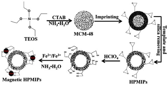 Other magnetic HPMIPs have been synthesized by using hollow Fe3O4 microspheres instead of conventional magnetite [45] (hollow Fe3O4 microspheres are obtained by one-pot hydrothermal methods [46]). In addition, other authors have prepared magnetic nanorings with abundant epoxy groups on the surface for imprinting purposes involving ring-opening reactions. The prepared material, named core–shell nanoring amino-functionalized magnetic molecularly imprinted polymer (CS-NR-Mag-MIP), was found to offer high absorption capacities for bisphenol A [47] and sulfonamides [48].