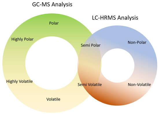 Two complimentary analytical techniques were employed: gas chromatography electron ionization mass spectrometry and liquid chromatography electrospray ionization high resolving power mass spectrometry. These techniques were optimized to complement each other to provide maximal coverage of the chemicals potentially present in the aerosol of ENDS products. The GC–MS method was optimized for the detection of volatile and polar compounds [39]. Concurrently, the LC–HRMS method was optimized for detection of non/semi-volatile compounds and non/semi-polar compounds [52] (Figure 1). These techniques employ comparison to a known amount of an internal standard to achieve a quantity estimation across multiple compounds. It should be noted, however, that while these complementary methods cover a broad chemical space, not all chemicals present in the aerosol are detectable under these methods. For example, chemicals such as metals, non-ionizable compounds, compounds that are not amenable to chromatography, or compounds outside of the mass-to-charge (M/Z) scan range of the mass detector cannot be detected.