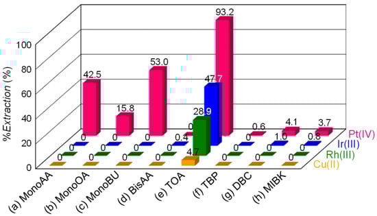 - Levitin, G.; Schmuckler, G. Solvent Extraction of Rhodium Chloride from Aqueous Solutions and Its Separation from Palladium and Platinum. React. Funct. Polym. 2003, 54, 149–154. [Google Scholar] [CrossRef]