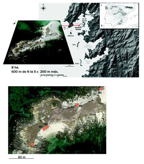 - López Romero, E.; Güimil Fariña, A.; Mañana Borrazás, P.; Otero Vilariño, C.; Prieto Martínez, M.P.; Rey García, J.M.; Vilaseco Vázquez, X.I. Ocupación humana y monumentalidad durante la Prehistoria Reciente en el islote de Guidoiro Areoso (Ría de Arousa. Pontevedra): Investigaciones en el marco de las dinámicas litorales atlánticas actuales. Trab. Prehist. 2015, 72, 353–371. [Google Scholar] [CrossRef] [Green Version]
