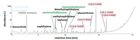 Many compounds with at least one atom of nitrogen (N-compounds) were identified (18.2 ± 11.2%; Appendix A), further indicating the contribution of microbial OM to the molecular fingerprints. These compounds include alkylpyrroles, alkylindoles, anilines and succinic acid ME. In addition to microbial N, these compounds (except for succinic acid ME) can also originate from plant protein, but as discussed below, on the basis of statistical data evaluation, this is an unlikely source of N. Finally, the N-compound benzonitrile was also identified in the chromatograms of most samples. The most probable source of benzonitrile is pyrogenic OM (PyOM) [20].