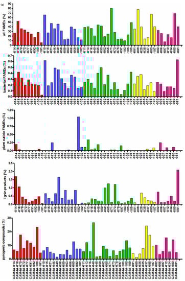 The THM-GC-MS chromatograms (Figure 3; Supplementary Material) allowed to identify and semi-quantify 104 compounds (Appendix A). Most of the THM products have a molecular structure based on polymethylene chains (32.5 ± 17.9% of TQPA; Figure 4). The dominant subgroup of these compounds are fatty acid methyl esters (FAMEs), accompanied with fatty diacids (DAMEs), linear alkanes and isoprenoid alkanes. The carbon number of the FAMEs ranges between 7 and 18. These compounds can originate from oils and fats (food remains) but also from fatty acid moieties from plant remains and microbial sources (plankton, fungi, bacteria, etc.). The presence of branched (iso/anteiso) C15 FAME probably indicates that at least some of the FAMEs originate from bacterial sources of OM. We identified traces of only one FAME with mid-chain methoxy substitution, probably from cutin (plant cuticles) in selected samples. We searched for some of the markers reported by Shoda et al. [25] and identified a minor trace of a compound that was tentatively ascribed to an isoprenoid pristane-based FAME with m/z 88 and 312 at the expected retention time of pristanic acid methyl ester (ME), and possibly m/z 101 and 326 of phytanic acid ME (too small for peak area calculation). It is concluded that the abundance (relative to total OM that was accounted for in the THM-GC-MS data evaluation) in the studied sherds is much lower than that of the samples studied by these authors [25], or not present at all, and biomarker evaluation for palaeodiet in the present data is not sustained.