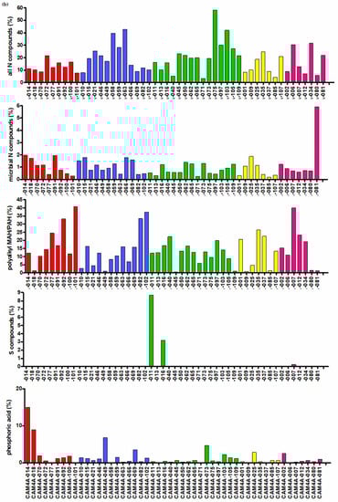 Monocyclic aromatic products include penta- and hexamethylbenzene (14.5 ± 11.4%), which may originate from marine sources [38] and which had not been observed in a study of fragments from non-coastal settlements in NW Spain [20]. This may indicate that some of N-compounds also originate from marine sources such as plankton, as will be discussed later.