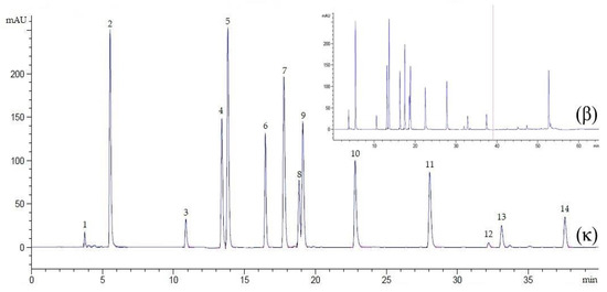 Chromatogram of an external standard mixture at λ = 272 nm, flow rate 0.9 mL/min, for 40 min (κ) and 65 min (β). Peak 1, ascorbic acid; 2, gallic acid; 3, catechin; 4, caffeic acid; 5, syringic acid; 6, rutin; 7, p-coumaric acid; 8, sinapic acid; 9, ferulic acid; 10, myricetin; 11, quercetin; 12, apigenin; 13, kaempferol; 14, eugenol.