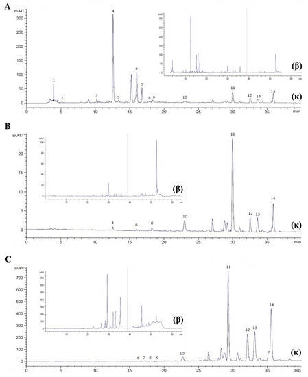 Chromatogram of P. sarmentosum leaves at λ = 272 nm, flow rate 0.9 mL/min, for 40 min (κ) and 65 min (β). (A), methanolic extract (20× dilution); (B), chloroformic extract (20× dilution); (C), hexanoic extract (5× dilution). Peak 1, ascorbic acid; 2, gallic acid; 3, catechin; 4, caffeic acid; 5, syringic acid; 6, rutin; 7, p-coumaric acid; 8, sinapic acid; 9, ferulic acid; 10, myricetin; 11, quercetin; 12, apigenin; 13, kaempferol; 14, eugenol.