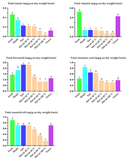 Processing methods, including the treatment of plant material by different drying treatments are acknowledged to have variable effects on antioxidant activity and phytochemical composition [29,44]. Quantitative evaluation of total tannin, vitamins, flavonoids, cinnamic acid, and essential oil in dried P. sarmentosum leaves using the developed HPLC method showed that the flavonoid content in P. sarmentosum leaves was the highest, followed by that of essential oil, cinnamic acid, ascorbic acid, and tannin (p < 0.001; Figure 4). Among the tested drying treatments, shade-, sun-, and 40 °C hot air oven-drying of fresh P. sarmentosum leaves significantly increased the chromatographic detection of flavonoids, cinnamic acid, and tannins. Freeze-drying and sun- or 40 °C hot air oven-drying improved the efficiency of the chromatographic detection of essential oils and vitamins. This finding was consistent with previous findings that the highest amounts of total tannin, vitamins, flavonoids, cinnamic acid, and essential oil were observed at drying temperatures below 50 °C [3,30,44]. Therefore, our results corroborate these previous reports. A possible explanation for these results is that low temperature during drying may protect the bioactive properties in plant material by preventing excessive breakdown of cellular constituents, a process that can result in decomposition, or in the combination of components previously bound with the other plant substances, such as cell wall macromolecules [59]. Notably, we optimized and developed the HPLC method to detect and quantify 14 synergistic compounds in leaves dried at various temperatures (from −80 to 100 °C). Therefore, this analytical method for simultaneously detecting phytochemicals and micronutrients can be applied to the determination of synergistic compounds in other plants.