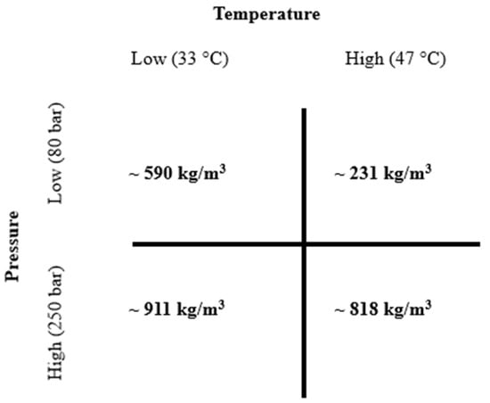 Supercritical carbon dioxide (scCO2) and estimated operating densities (in bold) according to Span and Wagner’s density tables. (~means approximately).