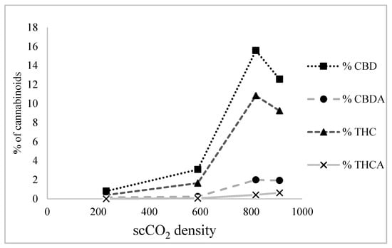 It was observed that, as scCO2 density increased, the amounts of CBD and THC in scCO2 extracts also increased. For example, at low density (231 kg/m3) the percentages of CBD and THC in the scCO2 extract were 0.81% and 0.40%, respectively. At medium density (590 kg/m3) this increased to 3.08% and 1.65%, respectively, whereas at high density (818 kg/m3), percentages sharply increased to 15.57% and 10.83%, respectively. This can be attributed to the fact that, at low density, scCO2 behaves like a highly non-polar solvent (c.f. hexane), while at high density, it acts like a moderately polar solvent (c.f. chloroform) [].