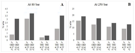 Effects of co-solvent (s) on supercritical carbon dioxide (scCO2) extraction of cannabidiol (CBD), cannabidiolic acid (CBDA), Δ9-tetrahydrocannabinol (THC), and Δ9-tetrahydrocannabinol acid (THCA). (A); at pressure 80 bar, (B); at pressure 250 bar.
