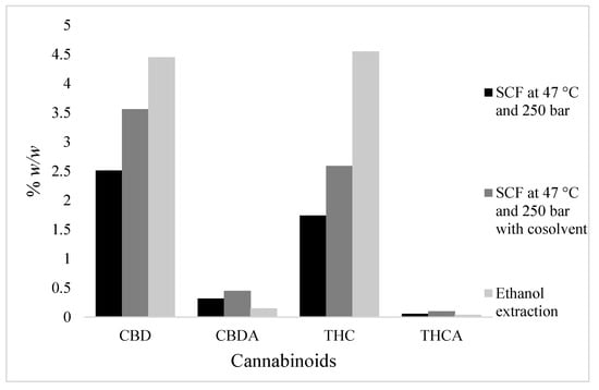 Based on the theory that like-dissolves-like, the main limitation of CO2 is its non-polar nature. The solvent ability of CO2 is similar to that of hexane; it dissolves mostly non-polar substances and some moderately polar substances. However, using a small amount of co-solvent or modifier such as ethanol and water, one can further improve the affinity and solvating power of scCO2 towards more polar solutes [,,]. Furthermore, the use of organic solvents in scCO2 extraction can improve the extraction yield and the selectivity of specific compounds within the extract. This creates a complex solvent/co-solvent mixture and further studies are required to monitor the solutes’ effects in such extracts. Recently, scCO2 extraction of cannabinoids was compared with pressurised dimethyl-ether, and propane, extractions (at 55 °C and 40 bar). The study claimed that cannabinoid extraction was higher (95 mg/g CBD and 1.20 mg/g THC) in extracts obtained at 100 bar and constant temperature (40 °C) compared to samples operated at 200 and 300 bar. The yield of CO2 extract (12.0%wt) was relatively higher than the yield of propane extract (8.2%wt) [].