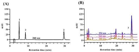 HPLC chromatograms of standard sample at 280 (A) and olive leaves at 254, 260 and 280 nm (B). 1. Oleuropein; 2. Hydroxytyrosol; 3. Tyrosol.